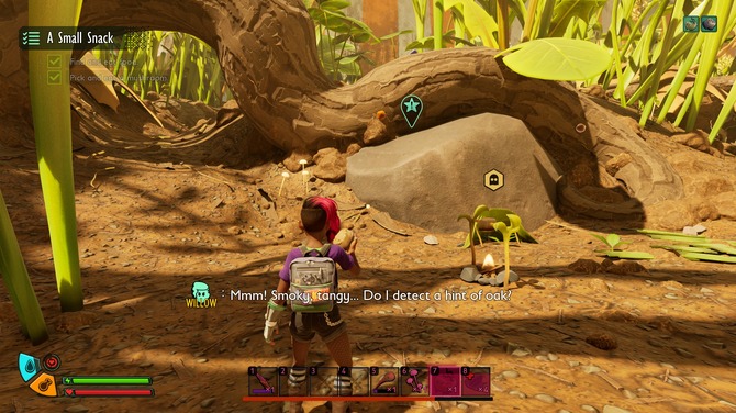 雑草ですら森のようなスケールに感じられる『Grounded 2』の世界では、葉っぱやタンポポの茎、虫の頭やパーツなどが貴重な素材として活躍します。ゲーム中は、公園内の各地を巡りながら、そのエリアごとに見つけられる素材を集めていかなければなりません。