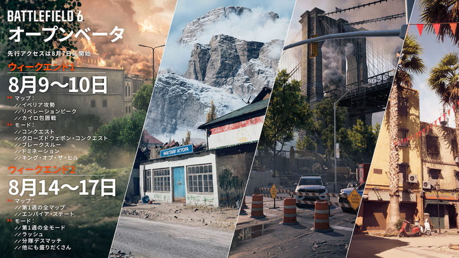 『バトルフィールド 6』はPS5/Xbox Series X|S/Windows(Steam、Epic Games Store、EA app)向けに10月11日に発売予定。オープンベータウィークエンド1が8月9日~10日、ウィークエンド2が8月14日~17日に実施されます。