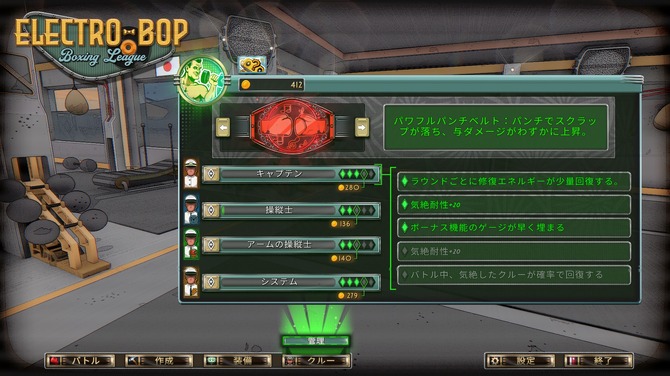 ボクシングの試合はオートバトルとリズムゲームの要素があり、パンチや移動だけでなく熱管理や強力なアビリティなどのアクションを、エレクトロ・スウィングのリズムに合わせて入力していく必要があります。リーグに勝ち抜くためにも、ロボットの改造や新たなパーツ・スキルの開発は欠かせません。