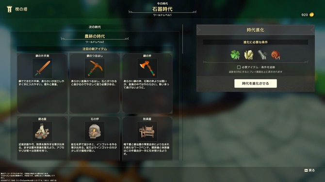カミールから依頼された塔の復旧には、その地域で獲得できる素材やアイテムが必要です。三段階復旧させることで、その塔で「時代進化」ができるようになり、進化させることでクラフトできるアイテムの種類が増加していきます。進化には各地域の名産品が必要になり、塔を復旧させればその地域の名産品が表示されるようになります。