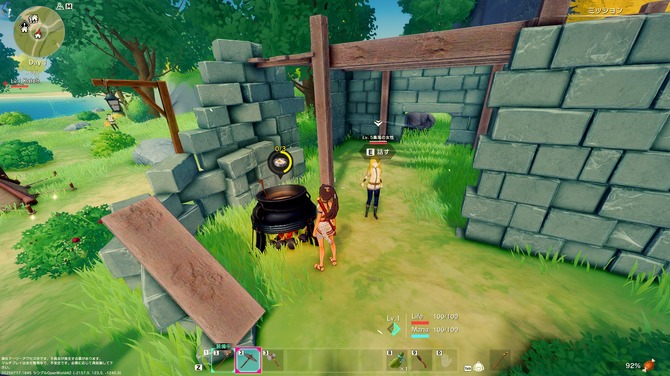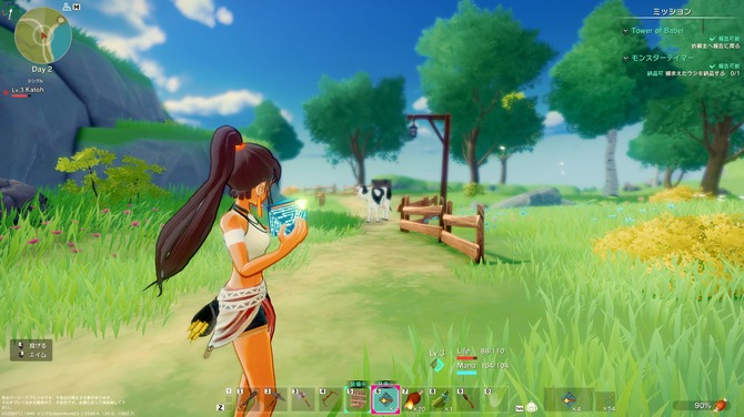 開始時は、道なりに進んだ村で出会ったNPC考古学者カミールの依頼を受け、近くにある塔を復旧させることが最初の目標となります。他にもこの村では、ゲームの基本となる戦闘や捕獲、クラフト、農業などに関する基礎を学べるチュートリアルのようなクエストが用意されているので、まずは一通りこなすのがおすすめです。