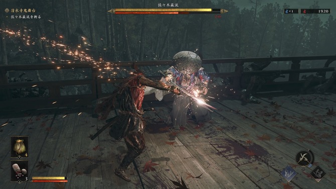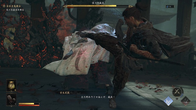 そして清水寺の本堂へと進むと、ボスである“佐々木小次郎”こと佐々木厳流とのバトルに突入。厳流は絶え間なく攻撃を繰り出してくるので、姿勢を崩されないよう適度に攻撃を受け流しながら、反撃のチャンスを見極める必要があります。