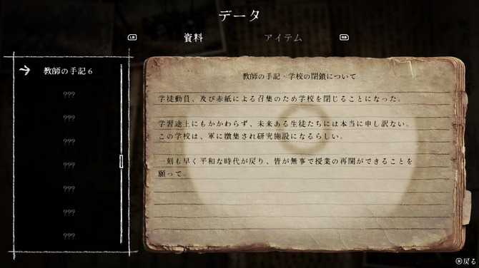 前述のように探索を進めていくとアイテムや仲間のほかに、本作の背景を示唆する資料が手に入っていきます。資料のひとつひとつは断片的な情報を示すのみで、それだけでは「学校で青鬼に追いかけられる」というシチュエーションを直接的に説明することはできません。