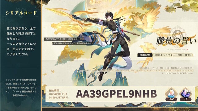 シリアルコードの有効期限は9月13日24時59分まで。数に限りがあり、全てを配布した時点で終了となりますので、使用はお早めに。