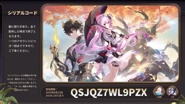 HoYoverseは、9月12日に行われた『崩壊:スターレイル』の情報番組「Ver.3.6「長き夜に再び大地へ」予告番組」にて、ゲーム内アイテムがもらえるシリアルコードを発表しました。