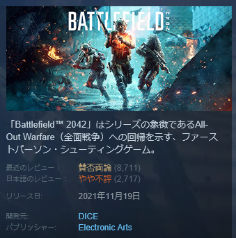 事実、Steamにおいて『バトルフィールド 2042』のユーザーレビューは2025年9月22日時点で約8,700件中高評価が47%で「賛否両論」であり、同作の評価が高くないことを開発プロデューサー自ら認めた形になります。