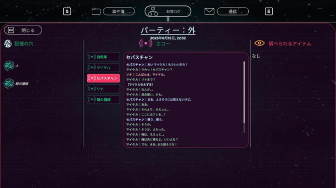 また、集めた情報がメニュー画面に詳しく記録される点も好印象でした。別の記憶で発見した手がかりであっても見返すことができ、何日何時の記憶なのかといった情報も表示されています。音声データやオペレーターの発言は文字起こしされているので、確認のために何度も再生しなおす必要はありません。