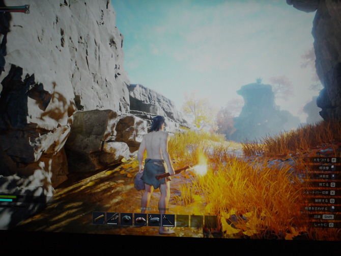 『山外山』で重要なのが「観察する」動きです。何をしたらよいのかわからない時は、とりあえず視界に入るものを片っ端からQキーで調べることで、素材を入手できたり、オブジェクトの使い道を教えてくれます。デモ版では木材と石を合成して手斧を作る合成システム、松明で進路をふさぐ植物を燃やしルートを開拓する方法など、困ったときには「観察する」を発動すればなんとかなります。