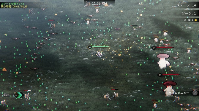 一方、戦闘に入ると四方八方から敵が押し寄せ、敵が落とす経験値ジェムを拾うとレベルアップ、一定時間経過すると戦闘が終了する……という本作のバトルは『Vampire Survivors』を踏襲しています。