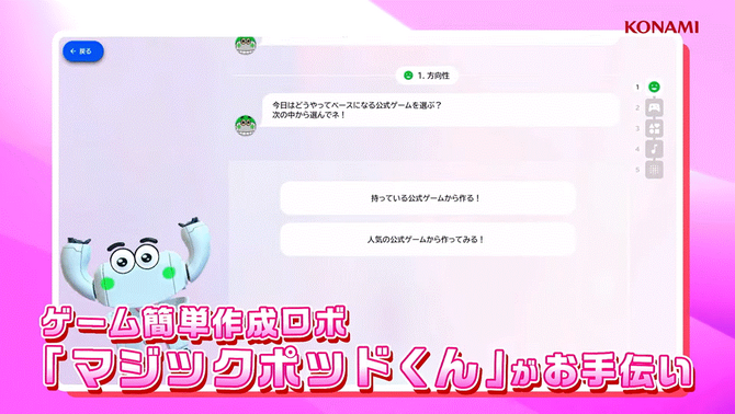 谷渕:本作はゲームを作るサービスなのですが、KONAMIのゲームの歴史や、業界そのものの歴史を踏まえ、自分が「こんなゲームがあれば良いな」というのを含めて、(ゲームを)作れるようにしたいと思った事が切っ掛けでした。