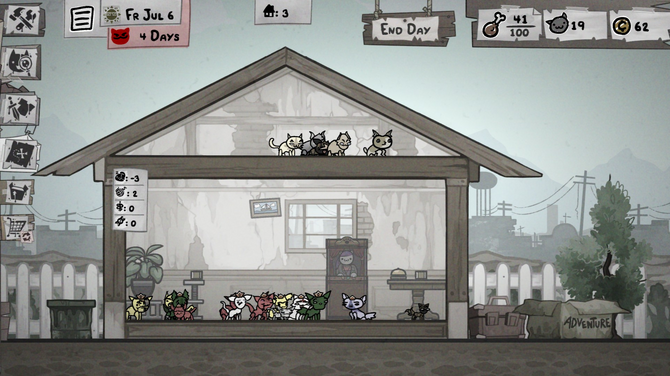 成否はともあれ、冒険が終われば家への帰還です。まず、一度冒険に連れ出したネコは帰宅すると引退し、二度と冒険には出られません。つまり、次の冒険のためにできればパーティー最大数の4匹分のネコを確保しなければなりません。ネコを増やす方法は大きく二つ、野良と子作りです。野良は一日に一匹、新たなネコが家に訪れるというものですが、子作りは戦闘と並んでこのゲームの遊び所です。
