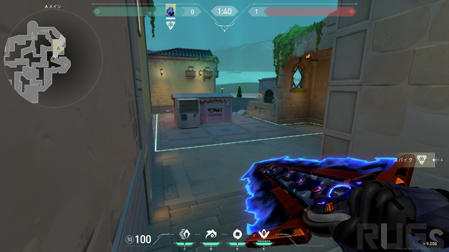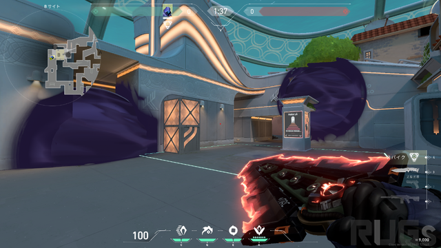 Aサイトは防衛サイドからの斜線自体が大きく開けていることはないものの、サイト内にスタックしてしまうと攻撃サイド側への逃げ場が少ないため、しっかりと設置後に前に出るか引いて守るか、残りアビリティーと相談する必要がありそうです。なお、中央のオブジェクト上にはスパイクを設置できません。