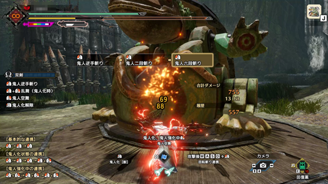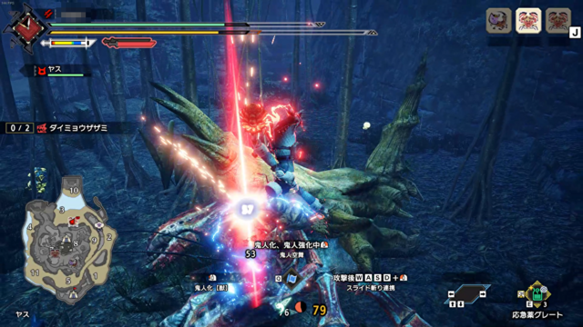 鬼人化はどちらも鬼人ゲージの溜まり具合が変更されており通常の鬼人化は溜まりやすく、【獣】の方はかなり溜まりにくくなっています。どれぐらい違うのかというと、鬼人化は鬼人六段斬りまで連携するだけでほぼ満タンに。
