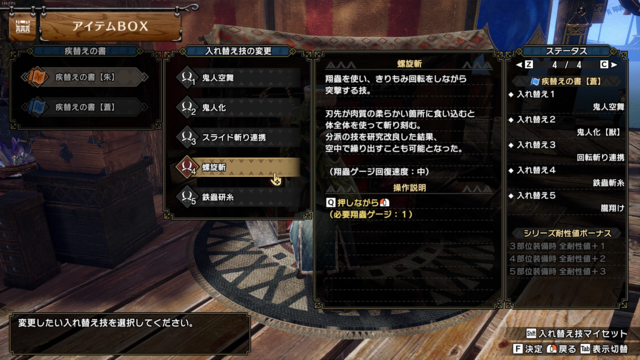通常技として追加われた「スライド斬り連携」は鬼人空舞のように回避判定を持っている技。「鉄蟲研糸」を積極的に使っていく構成であれば、入れておいて損はないでしょう。回避判定があるので、回避性能に使う部分も減らせます。入れ替え対象は回転斬り。