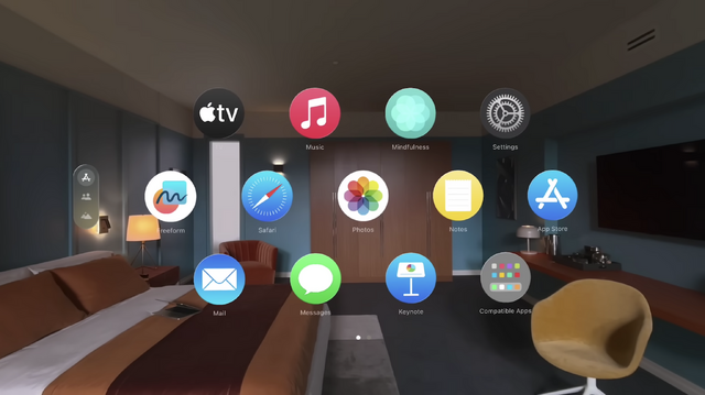 たとえば、MacBook、たとえばiPhoneというモノを見つめる制限を受けずに、空間全体でコンピュータ体験を得る、iCloud情報にアクセスする……というものだと思う。