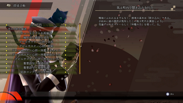 次の目的や事件捜査に関する情報をはじめ、ゲームの操作方法や戦闘時のコツなどをまとめた「探偵手帳」の機能が強化されます。操作に行き詰った際には、メニュー「探偵手帳」を確認し、情報を再確認しましょう。