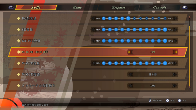 物語本編がフルボイス化され、作中の臨場感を耳でも体験することができますが、環境や好みによってボイスを聞きたくない場合があるかもしれません。環境設定でボイスのON/OFF自由に切り替えられるので、好みや状況に合わせて使いこなしてください。