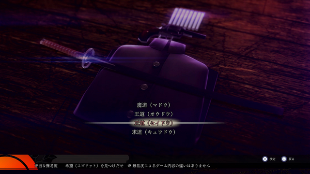 『RAIDOU Remastered: 超力兵団奇譚』には、5段階の難易度設定が用意されています。主人公と仲魔が死亡しない「魔道」、やさしい難易度の「王道」、通常の難易度となる「正道」、苦難に満ちた難易度「求道」、ゲーム2周目以降にのみ選択可能な最高難易度「超・葛葉ライドウ」と、その範囲はかなり広め。