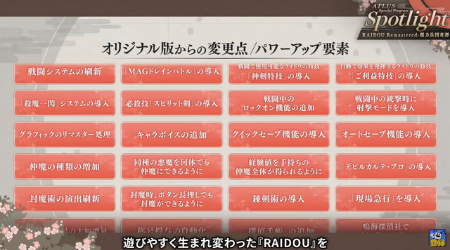ここまで紹介した要素だけでもボリューム満点ですが、実はまだまだ終わりません。発表に合わせて公開された動画「『RAIDOU Remastered: 超力兵団奇譚』Spotlight」にて、一覧の形式で変更点やパワーアップ要素が羅列されており、その項目の多さには驚くほかありません。