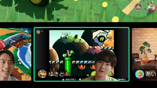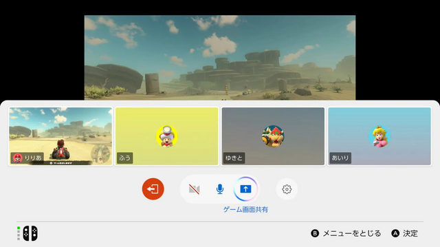 画面共有機能も備わっており、ゲームの画面を見せ合いながら楽しむことが可能です。スイッチ2と同日発売の「Nintendo Switch 2 カメラ」を接続すれば、顔を見せ合いながら楽しむことができるほか、ゲーム画面をバックにして顔を写したり、一部ゲームではアイコン部分に顔を映すことも可能なようです。