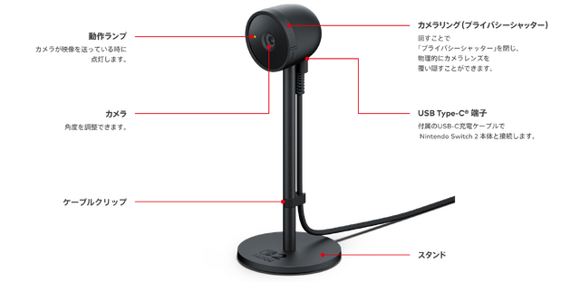 この機能紹介の中で、ニンテンドースイッチ2向けの周辺機器として「Nintendo Switch 2 カメラ」も発表されています。本カメラは、部屋全体を映す広角レンズの内蔵や高感度イメージセンサーによる検出・補正機能が搭載されています。また、カメラ使用時以外に誤って部屋や自身が映らない「プライバシーシャッター」も使用可能です。
