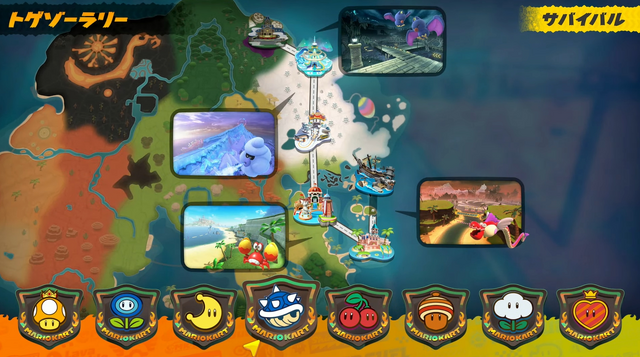 今回の配信にて、新モード「サバイバル」の内容が発表されました。サバイバルは世界を結ぶ一本のルートを舞台にしたレースモードで、チェックポイントごとに決められた順位以下のキャラクターは即脱落というルール。ポイントごとの駆け引きが求められるレースになるようです。