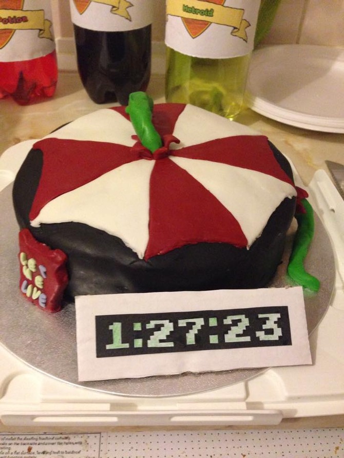 こちらは『バイオハザード』をフィーチャーした特製ケーキ。飾り付けのプレートに書かれた「1:27:23」は、投稿者icaruslament氏の『バイオハザード 2』のタイムアタック記録だそうです。