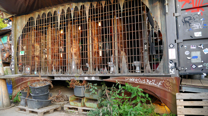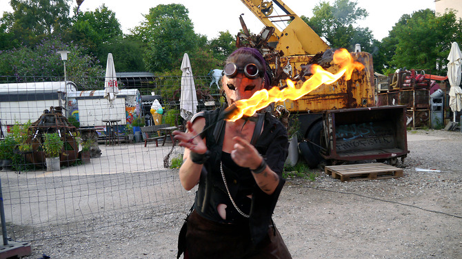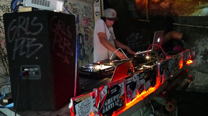 ガソリンまき散らしながら火遊びするお姉さんがお出迎え。怖い。いろいろアウト。お手洗いも危ない空気。これは入りづらい……。ビールもエナジードリンクも飲み放題!爆音でHip-Hopチューンを回す地元DJ。※次ページ: 世紀末戦士たちやマグナム・オプスとご対面!