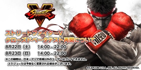 カプコンは、先月末にログイン障害のため中断していたシリーズ最新作『ストリートファイターV』のクローズドベータテストを再開すると発表しました。このテストは日本・アジア地域限定となるもので、期間は日本時間8月22日と8月23日の14時から22時までとなっています。なお、CBTは過去に抽選で当たったユーザーのみが対象です。