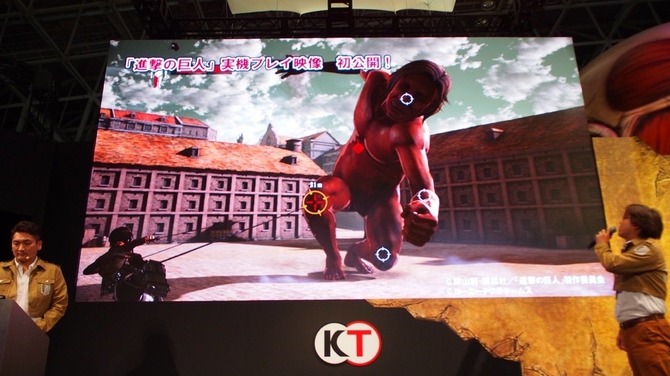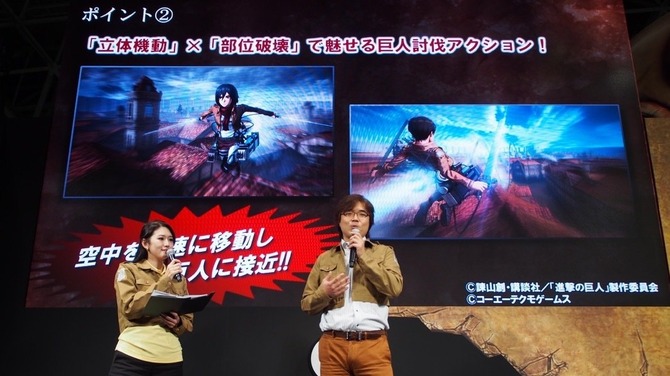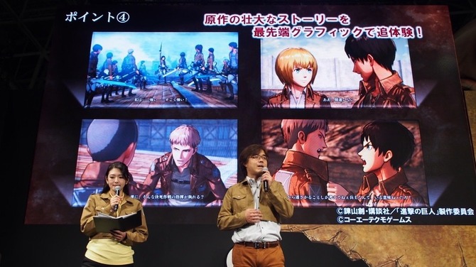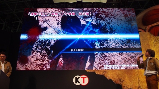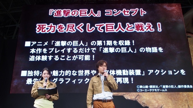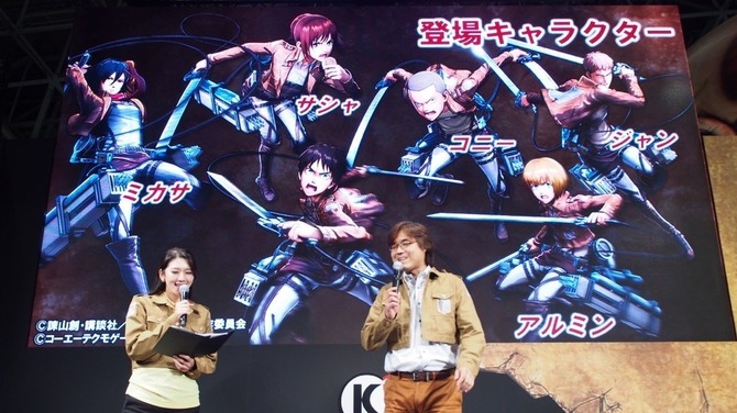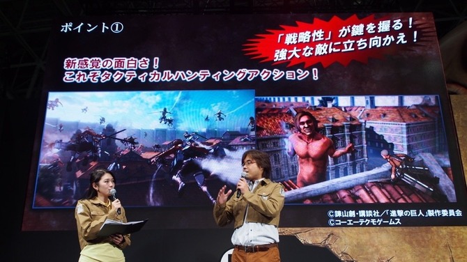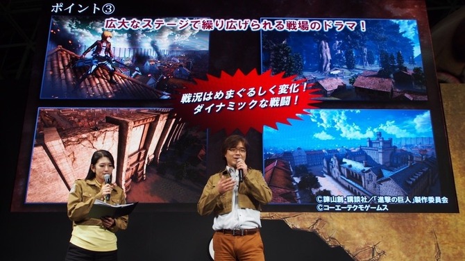 イベントには、調査兵団のジャケットを身に纏った本作のプロデューサー鯉沼久史氏が登壇。まずは8月に初お披露目となったドイツで行われたGAMESCOMの様子と、漫画やアニメ、映画など「進撃の巨人」関連コンテンツの盛り上がりが紹介されました。