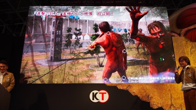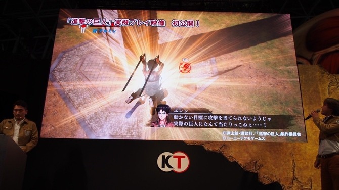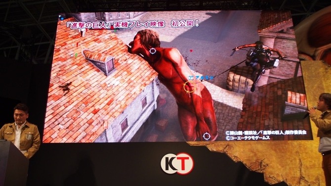 そしてこここからは、本作のディレクター喜多村智行氏が登壇し、初の実機プレイが行われました。なお本作はテスト版となっており、UIなどは仮のものとなっています。プレイでは、立体機動を使って上下左右に自在に動きまわる激しいアクションや巨人の手足をもぐ部位破壊、弱点であるうなじを攻撃して一刀両断する爽快感を感じることができました。