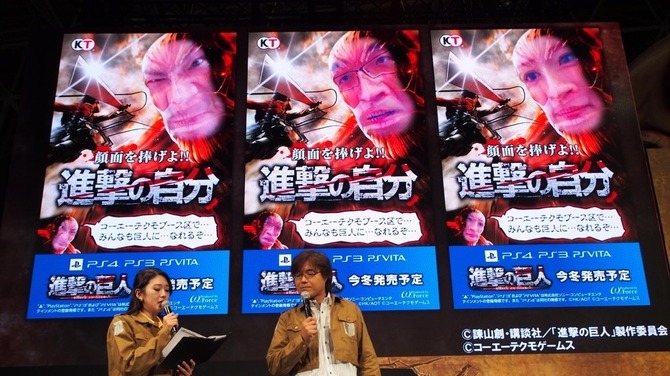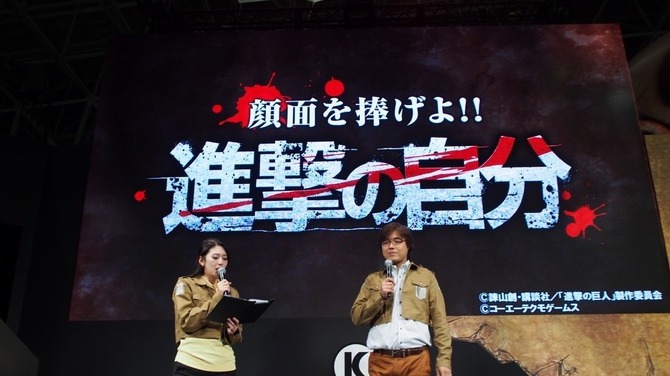 東京ゲームショウ会場では、「進撃の自分」と題したイベントが実施。自分の写真使って巨人になった姿を見ることができ、作成された画像はスマートフォンにダウンロードすることができます。来場の際は顔面を捧げてみてはいかがでしょうか?