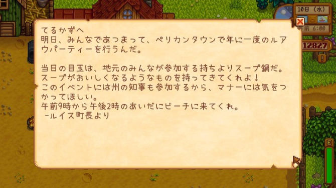 朝起きるとポストに町長からの手紙が入っていた。手紙の内容を要約すると「年に一度のルアウパーティーを開催するから、目玉イベントであるスープ鍋の為に材料を持ち寄ってくれ」との事だ。