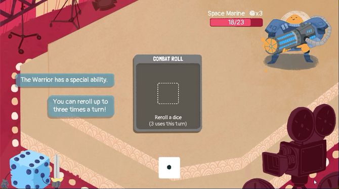 ゲムスパのターン。ダイスの出目は1です。ここで戦士のアビリティ「コンバットロール」。好きなダイスを振り直せます(3回まで)。3回振り直して6が出たので、ソードに使って6ポイントのダメージです。今はチュートリアルなので分かりやすくするためカードを1枚ずつ表示していますが、実際のバトルでは装備しているカードが画面中にすべて表示されます(後述)。
