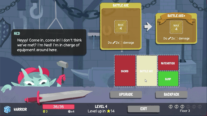 「EQUIPMENT」では装備を入れ替えられます。画面右にあるのが装備状況で、「ソード、バトルアックス、マッチ棒、バンプ」が装備されているのが分かります。カードには大きさがあり、ソードとバトルアックスは2マス占有してしまっていますね。これ以上カードが増えた場合は、左側の「IN BACKPACK」に並びます。装備の入れ替えはマップ画面でしか行えません。