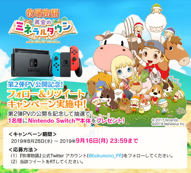 第2弾PVの公開を記念して、「牧場物語」公式Twitterにてフォロー&リツイート キャンペーンを実施中です。9月16日(月)までの期間中、「牧場物語」公式Twitterアカウント(@bokumono_PR)をフォローして、当該ツイートをRTしてくれた方の中から抽選で1名様にNintendo Switch本体をプレゼントします。キャンペーンの詳細は、公式サイトをご覧ください。■キャンペーン期間