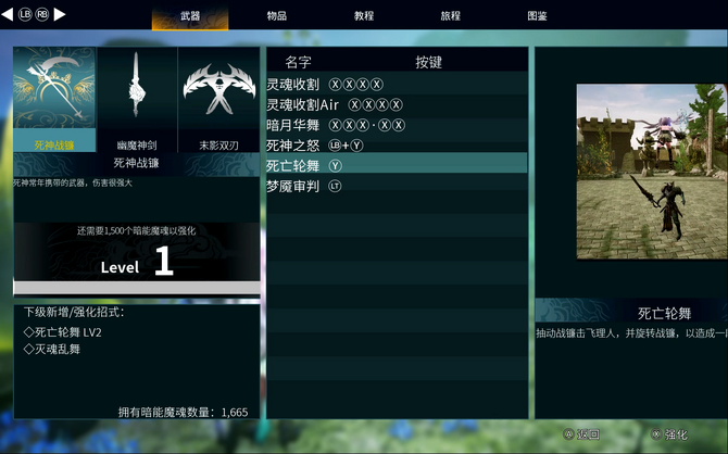 ゲームを一時停止したときに出てくるメニュー画面では、敵を倒すことによって獲得した暗能魔魂を消費して、武器をレベルアップさせられます。また技やコンボもムービー付きで確認することが可能。レベルが上がると、新たな技を覚えます。