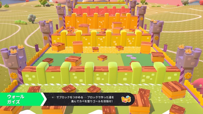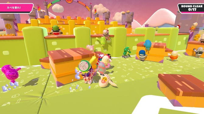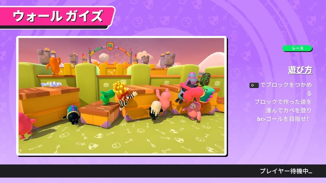 さまざまな高さの足場を駆使して、複数ある高い壁を越えてゴールを目指すレース。本作では数少ない「他のプレイヤーと協力する個人戦」です。足場はつかみ状態で少しずつ動かすことが可能です。