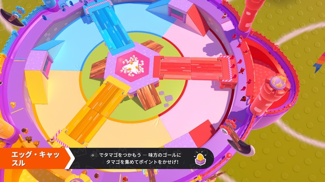 中央に配置されている卵を自陣のゴールに持ち帰ることで得点となるチーム戦。1点の通常卵と5点の金の卵の2種類が用意されています。最終的に得点が一番少ない1チームが失格となります。 たまごはつかむアクションで手に取りることが可能です。また、相手を一定時間つかむことで持っている卵を手放させることもできます。ゲーム開始直後ではかなり不毛なつかみ合い合戦がはじまりますが、そこでいかにして得点を稼ぐかが重要になります。こぼれてくる卵もかなり多いのでフォローに回るのも悪くありません。