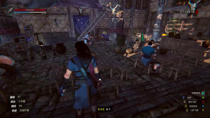 操作方法ですが、RTでローリング、RBで防御、LTで回避(短距離ダッシュ)、A,B,X,Yボタンは攻撃です。さらに十字キーの左右上下で武術の型を切り替えられるので、攻撃技は4X4の16種類あることになります。随分多いですね。