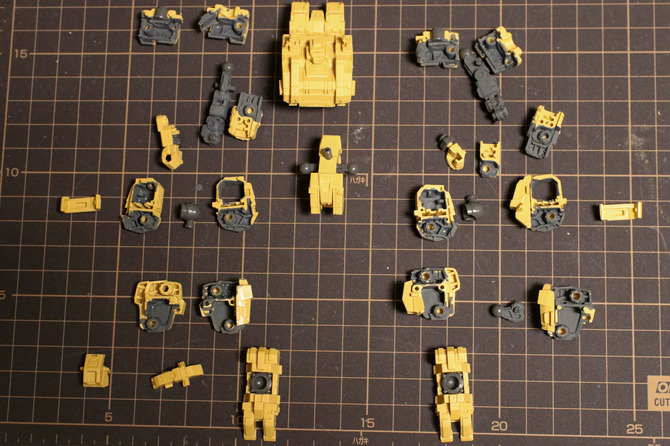 筆塗りでは、前述の脚部はめ込みパーツと関節部を分解し、裏面をアクリジョンベースグレーで下地を整えてから本塗装に入ります。筆はタミヤモデリングブラシ平筆No.1を使用しました。