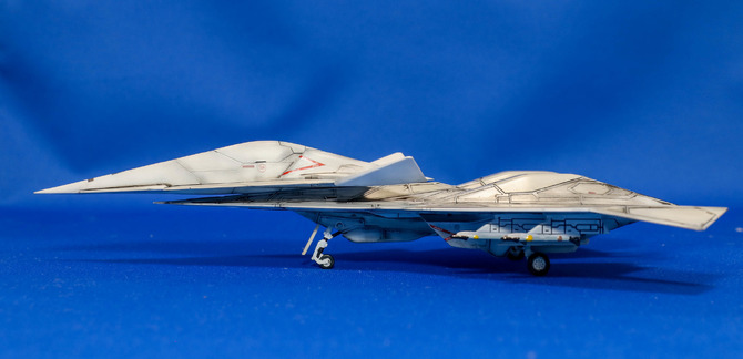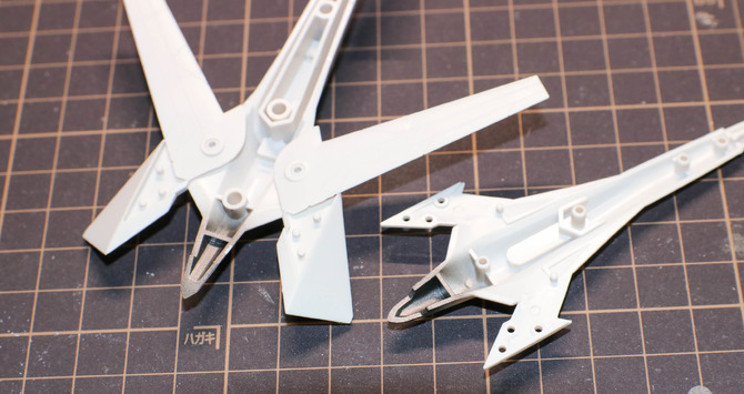 塗装において1/144「ADFX-10F」は、綺麗に仕上げようとすると、広範囲に及ぶ合わせ目の処理や複数の白とグレーを用いて塗装する必要のある若干難易度の高さを感じるプラモデルですが、完成した時のビジュアルは魅力的です。