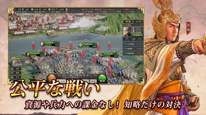 リアル感あふれる三国志の戦場では、知略が追求される。資源、兵士、時間を早めるためのアイテムは販売されないこと、武将の能力値だけで相手に勝つことはできないことが、この舞台の公平性を表している。知略がすべてであるため、正々堂々の対決となる!