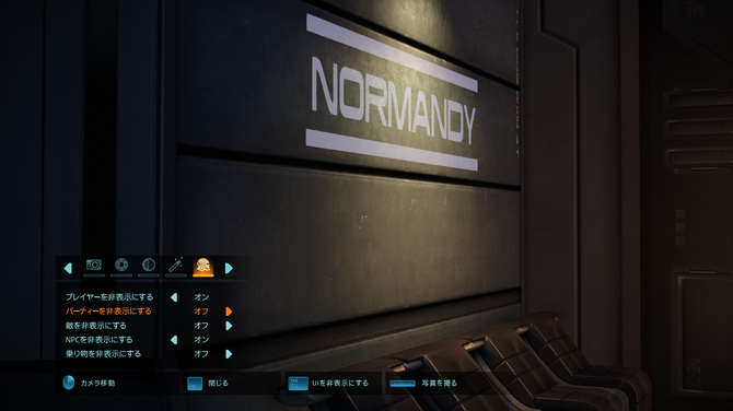 『Mass Effect Legendary Edition』ではフォトモードも搭載されています。フォトモードでは、カメラ・レンズの種類や焦点距離、被写界深度、ぼかしの強さといった基本的なことはもちろん、キャラクターや車両のモデルの表示を消すこともできます。