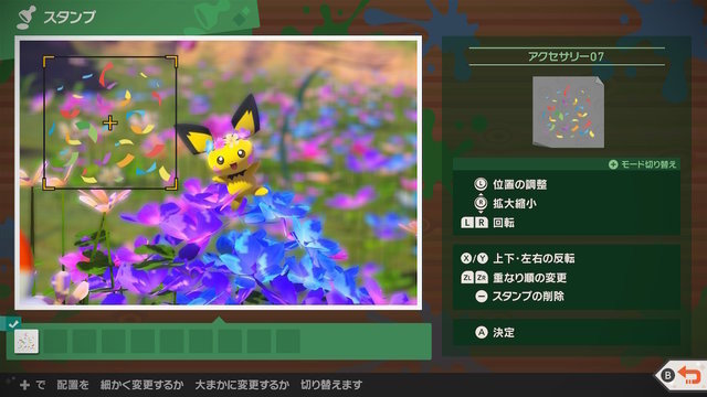 スタンプを多めに使いたいなら、エクストラ撮影の段階ならぼかしを使って背景の情報を減らしておきましょう。スタンプを使うと背景と邪魔し合ってしまうので、ポケモンだけがよく見えるように調整し、スタンプを配置できる余白を作ります。
