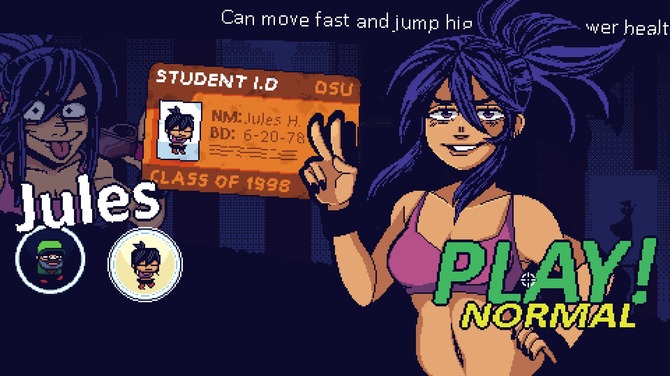 冒頭のムービーにも登場したJeffとJulesは、ゲーム開始時においてプレイヤーが最初に選択できる操作キャラクターです。難易度もここから選択できるので、もし難しすぎる(易しすぎる)のであれば変更すると良いでしょう。TOO YOUNG TO DIEがイージーモードで、選択すると敵の移動速度が半減するのでだいぶ戦いやすかったですね。ちなみにSteamストアの説明によれば、合計8体まで操作可能で、ゲームクリア時に特定の条件を満たしていればアンロックされるようです。