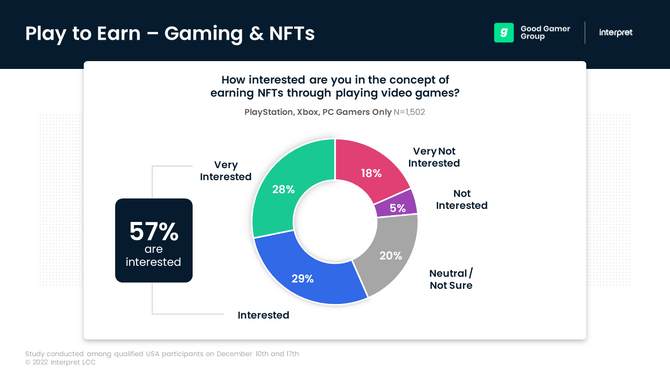 一方でデジタル市場調査企業Interpretが公開したアンケート結果では、「ゲームをプレイしながらNFTを獲得するのに興味がありますか?」との質問にゲーマーの57%が興味を示しました。このアンケートは「NFT/暗号通貨ゲーミングパネル」から選ばれた1,500人を対象にしていることから、サンプルには“元々NFTに興味のある人が多かった”可能性が考えられます。