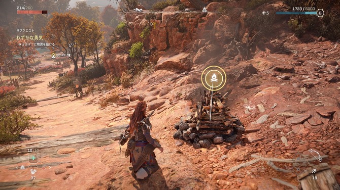 またコンパス上において、マーカーにアーロイの進行方向を重ねると、「〇〇に合う」「機械獣の群れ」などの情報が添えられ、「到着までの歩数」とともに表示されます。これらをあわせると各地点までの距離感をはっきりと読み取れるようになります。メインクエストへ向かう道中、そう遠くない距離に別のタスクがあるのでやってみよう、という判断はこういった機能のおかげでより効率的に行えますね。