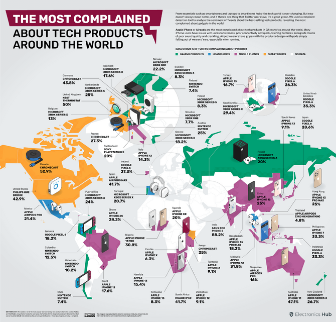 電子機器情報プラットフォームElectronics Hubは、世界各地における“ハイテク機器に対する苦情”を統計データ化して公開しました。