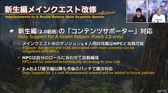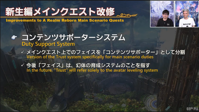 以前の放送でもお知らせされていた、『新生エオルゼア』のメインクエストで行くことになるダンジョンに「フェイス」が対応することで、メインストーリーをひとりでも遊べるようになる機能ですが、こちらについての詳細も発表されました。そのうえで、今後は「フェイス」という名称から「コンテンツサポーター」という名称に置き換わるというアナウンスも。以降「フェイス」という名称はNPCの幻体を育成するシステム、つまりやりこみ要素的な部分が「フェイス」と呼ばれるようになるそうです。